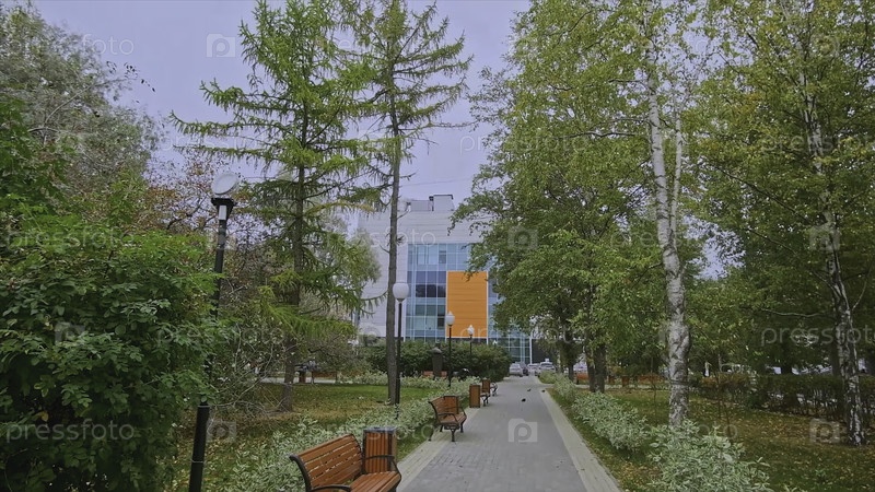 Красивый парк рядом с городом. Клип. Зона отдыха в парке в центре города. Прекрасные тропы улицы парка в зеленом городе. Парки и зоны отдыха