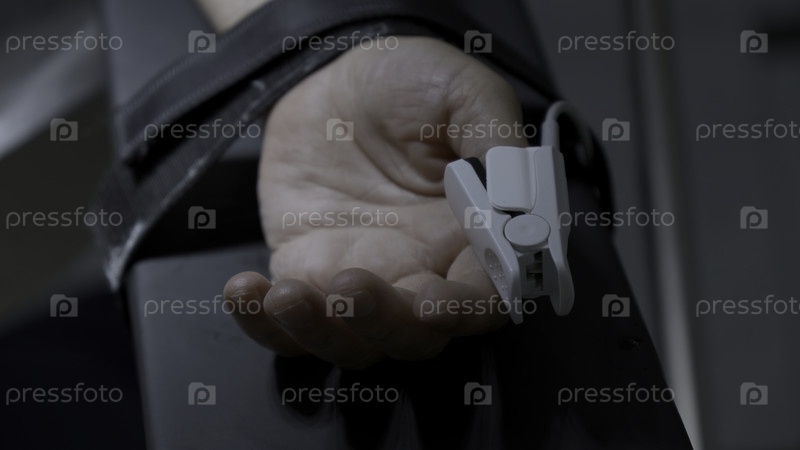 Ближайшее изображение неузнаваемой руки пациента с помощью пульсоксиметра на пальце. Действие. Процесс медицинской хирургии