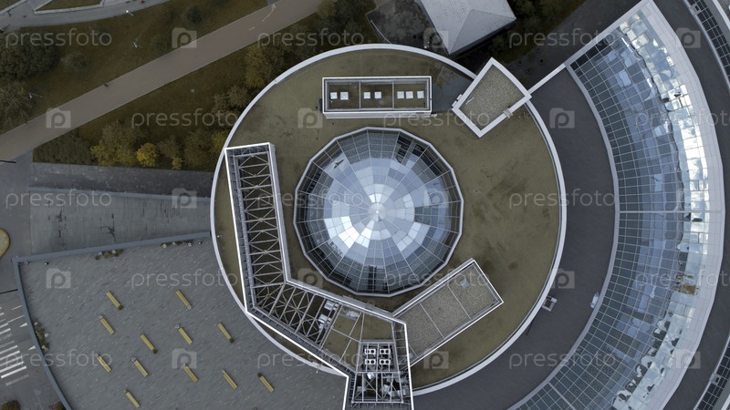 Вид сверху на современное круглое здание с куполом. Снимок акций. Красивая архитектура бизнес-центра с круглым строением и куполом. Кольцами здания с красивым фасадом