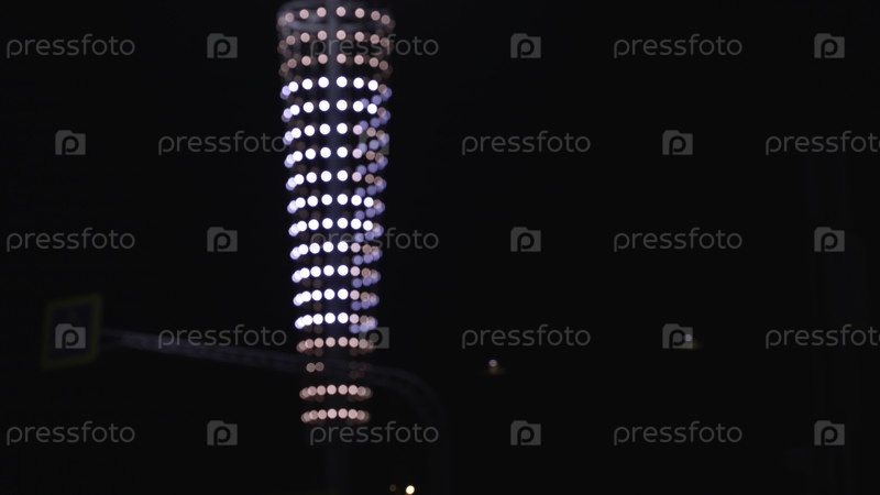 Размытые огни гирлянды на фонарике ночью. Стоковые кадры. Светящаяся гирлянда вокруг лампочки. Дефокус гирлянды на столбе в ночном городе