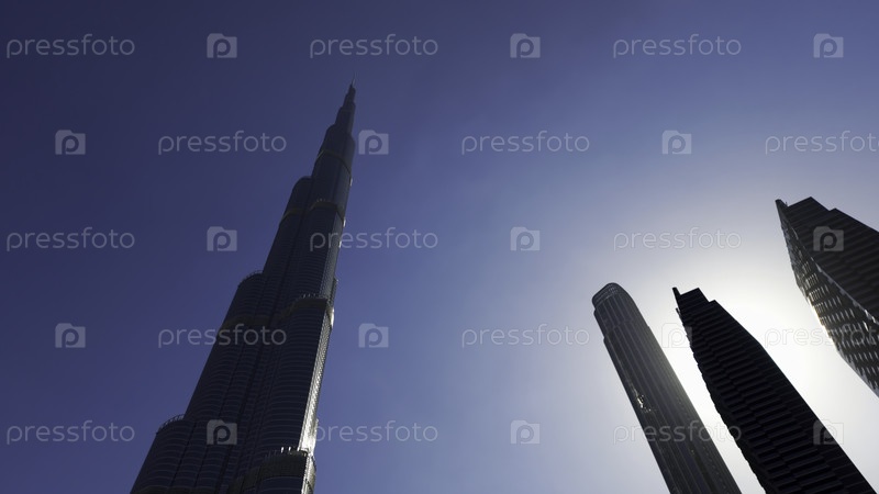 Низкий угол взгляда на Бурдж Халифа с голубым небом позади. Акция. Современный небоскреб со стеклянным фасадом в центре города