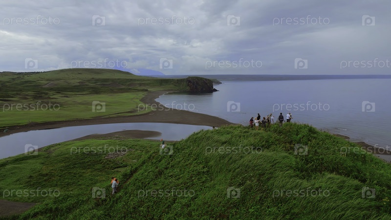 Концепция туризма, группа людей на вершине холма. Клип. Вид с воздуха зеленой травы и берега моря