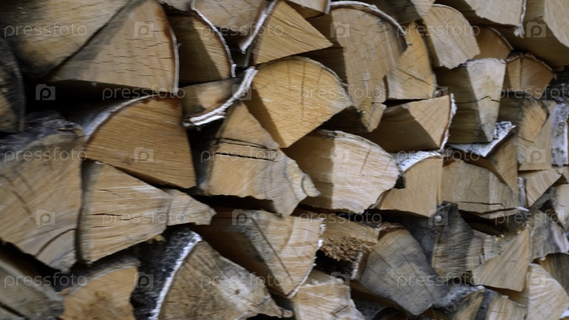 Закрытие сухих нарезанных стволов деревьев прокладывается рядами.Средства массовой информации.Накопленная дрова подготовлена для камина и плиты