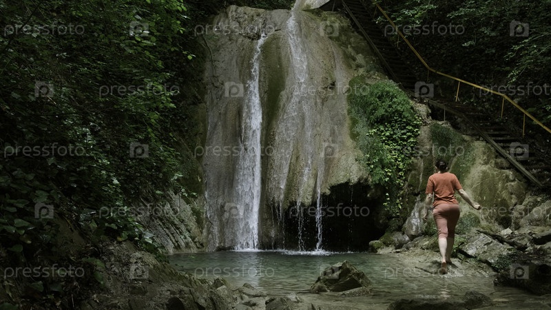 Женщина, идущая босиком к водопаду возле живописных туристических деревянных лестниц