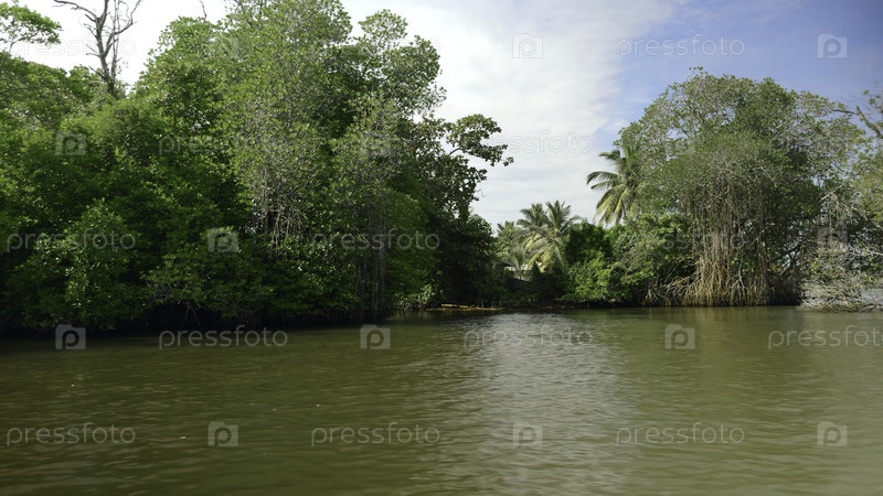 Вид от первого лица с лодки, плавающей на реке через мангровые рощи в диких тропических лесах. Действие. Зеленые кустарники и деревья и грязная река