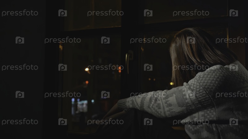 Задний вид женщины, сидящей печально у окна. СМИ. Женщина в свитере сидит одна возле окна. Депрессивная молодая женщина грустит дома ночью на лошади