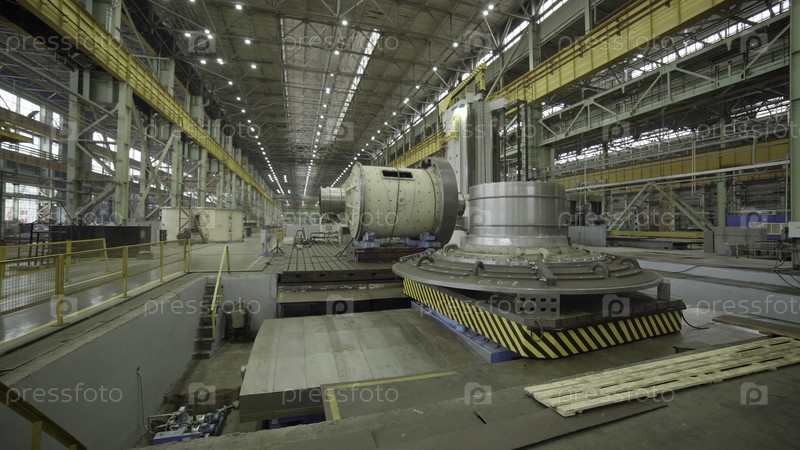 Большое, экспансивное промышленное пространство, которое демонстрирует множество тяжелых машин и различного производственного оборудования