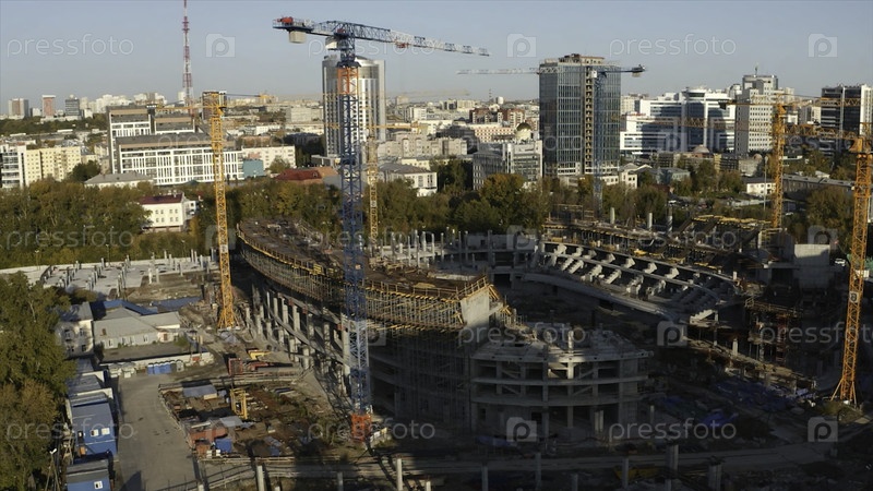 Вид сверху города со современными зданиями и строительством. Скриншоты. Строительный участок здания с кранами в центре современного города. Строительство стадиона в центре на горизонте с городом в солнечный день
