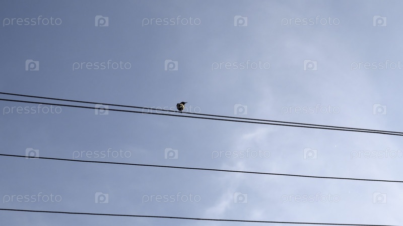 Птица, сидящая на линии электропередачи.СМИ.Одинокая птица на проводе против голубого облачного неба