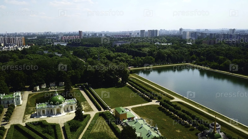 Дворец с прудом на фоне современного города. Креативность. Вид с вершины красивого исторического комплекса в солнечный летний день. Палатовые здания с садом и водоемом с контрастом современного города на горизонте