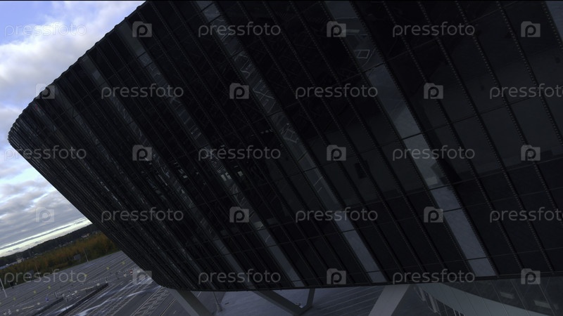 Летание вокруг стеклянного здания, выставочного центра. Фотосъемки. Концепция дизайна современной архитектуры