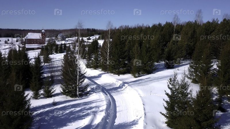 Вид сверху снежной дороги в хвойных лесах. Клип. Красивая снежная дорога для внедорожного вождения в лесу. Зимняя снежная дорога для мотоциклов в солнечный день