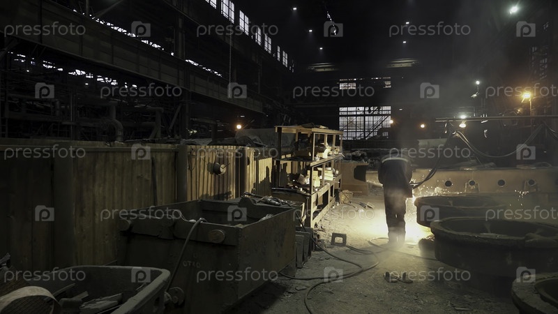 Промышленная мастерская, наполненная летающими искрами и тяжелым оборудованием во время сумерек