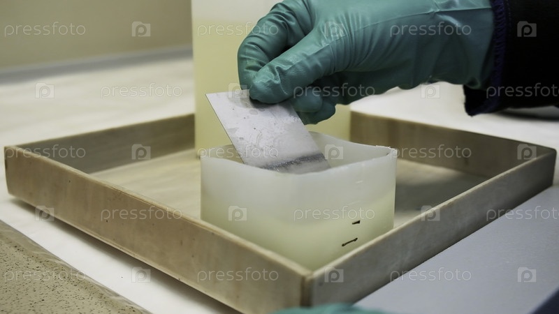 Концепция лабораторных исследований.Клип.Закрытие рук в перчатках, помещение тонкой металлической пластины в химическую жидкую субстанцию