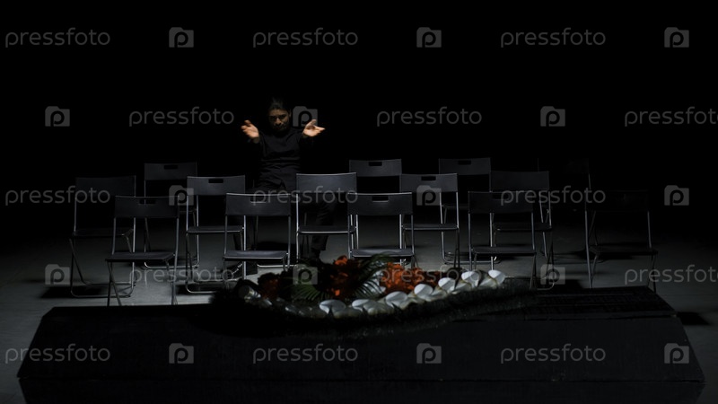 Драматические похороны с одним мужчиной. Скриншоты. Харизматичный мужчина хлопает в ладоши на похоронах в драматической театральной сцене. Безумный одинокий человек, аплодирующий на похоронах