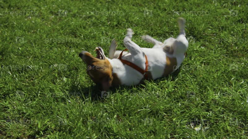 Собака качается по траве. Скриншоты. Собака счастливо лежит на траве в солнечный летний день. Собака веселится, катаясь на зеленой траве летом