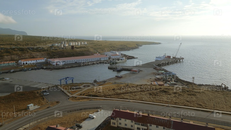 Вид сверху морского порта с песком на северном побережье Клип. инфраструктура морского порта на берегу моря Красивый пейзаж деревни с морским портом на берегу горного побережья