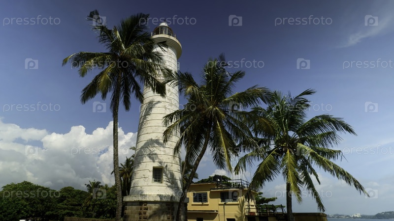 Маяк Галле в форте Галле, Шри-Ланка.Действие.Прекрасные пальмы и голубое облачное небо