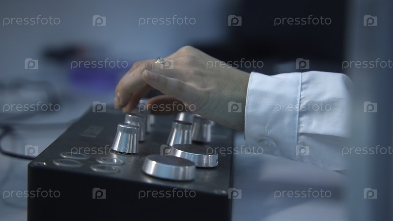 Ближайшее изображение женщины, вращающейся кнопками на панели управления оборудованием. Фрагмент кадров. Женщина поворачивает кнопки на панели лабораторного оборудования. Оборудование с пуговицами в научной лаборатории