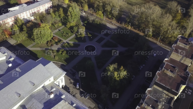 Образец парковых дорожек возле здания. Клип. Вид сверху дворового ландшафта с парком рядом со зданиями. Линии пешеходных троп в ландшафте двора с парком