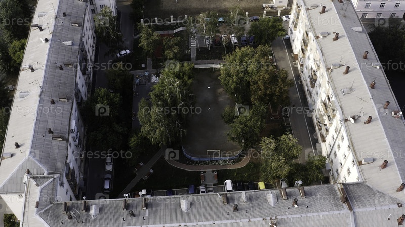 Небольшой зеленый летний двор, окруженный жилыми домами квадратной формы. Фотосъемки. Вид с воздуха на жилую зону с небольшим спортивным стадионом