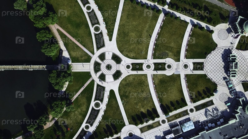 Ландшафтный геометрический сад. Креативность. Вид сверху на геометрические тропы с узором. Люди гуляют в историческом парке с геометрическим ландшафтом