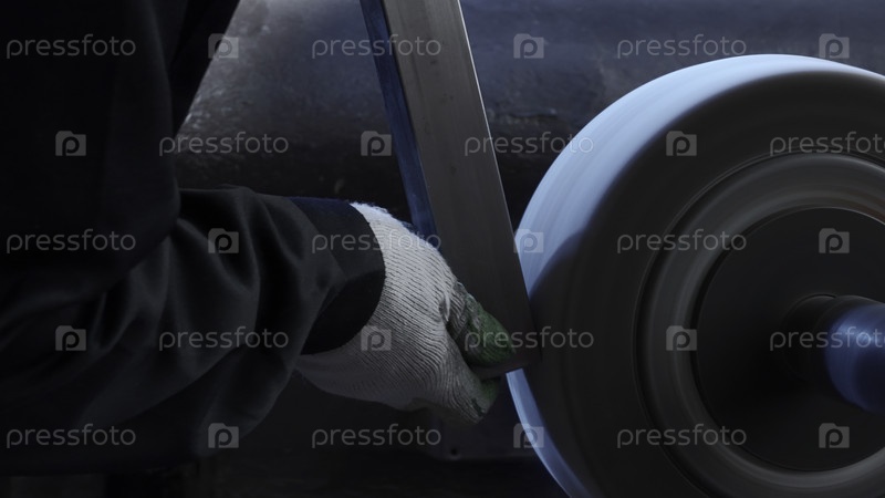 Ближайшее изображение сотрудника, работающего на фабрике с шлифовальной машиной.Креативно.Шлифование металлической длинной балки