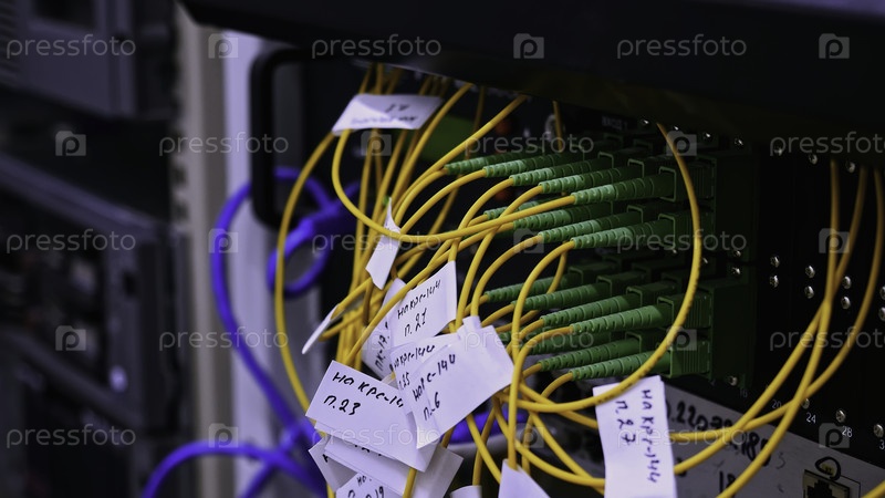 Ближайший снимок панели соединителя оптического волокна с желтыми и зелеными кабелями. Фрагмент кадров. Внутренние детали серверной комнаты