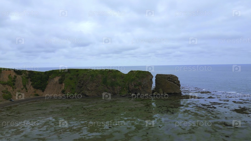 Скалистое побережье с водорослями после шторма. Клип. Сверху вид водорослей на берегу скалистого побережья в пасмурную погоду. Морские водоросли на побережье после шторма