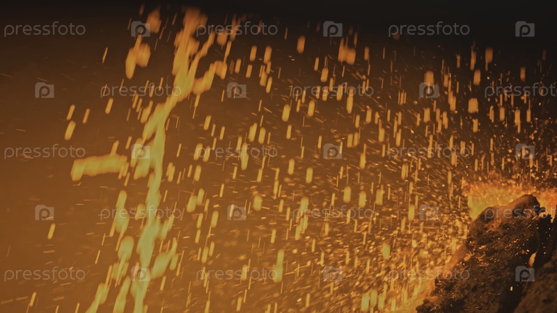 Плески расплавленного металла на заводе. Скриншоты из запасов. Яркие плесени расплавленного металла перемещаются по потокам. Металлургическое предприятие с плеснями и потоками расплавленного металла