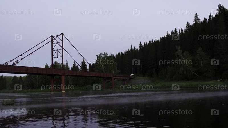 Спокойный вид на красный подвесной мост, окруженный пышной зеленью и туманными водами в спокойное сумерки