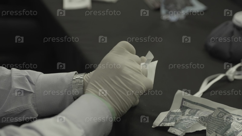В этом видео человек надевает перчатки для гигиены, очищает повязку, показывая безопасность при обращении с медицинскими принадлежностями и держит деньги, что означает заботу о здоровье и финансах