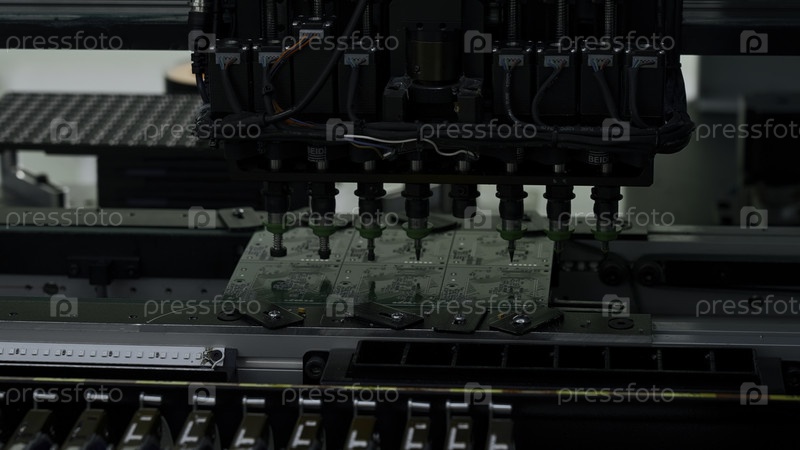 Автоматическая машина для подбора и помещения устанавливает компоненты на плату электрической схемы.Креативное.Промышленность по производству электронных устройств