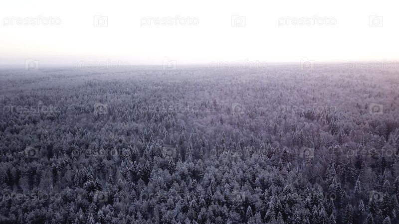 Декабрьские холодные морозы. Клип. Вид из вертолета заснеженных елей, стоящих рядом друг с другом