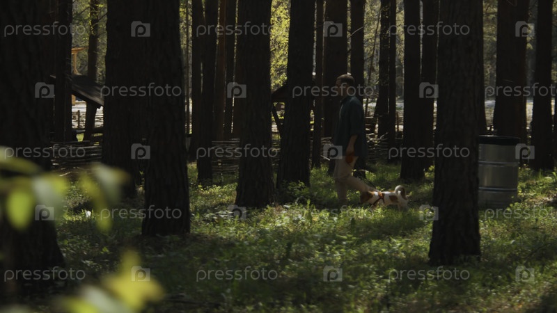Мужчина гуляет с собакой в парке в летний день. Скриншоты. Человек прогуливает собаку на поводке в лесу в солнечный летний день. Мужчина гуляет с терьером Джека Рассела в рекреационном центре в лесах