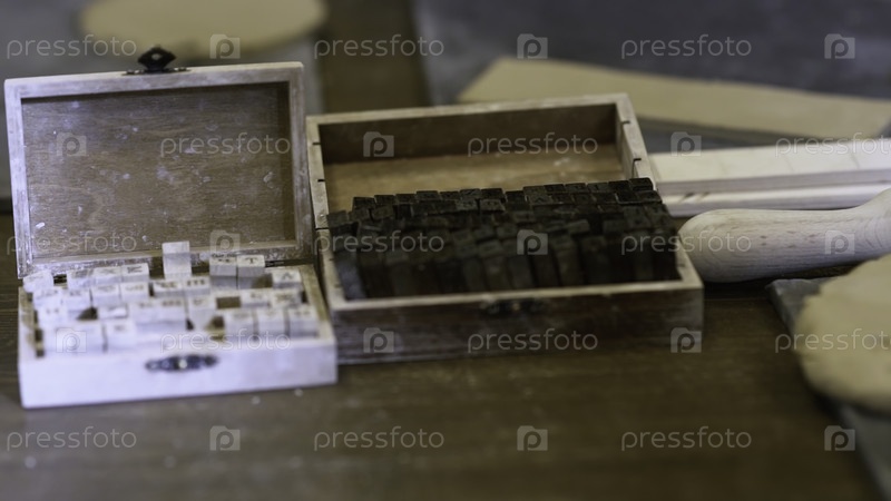 Антикварные шрифт-блоки красиво хранятся в очаровательной деревянной коробке, идеально подходящей для старинных проектов печати
