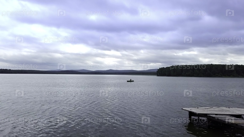 Красивый и спокойный вид на тихое озеро, демонстрирующее драматическое небо и маленькую лодку
