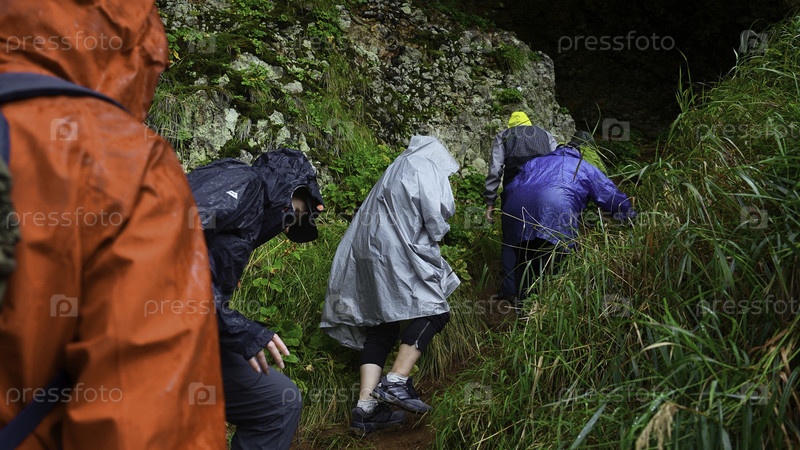 Группа туристов идет в пещеру.Клип.Туристы попадают в пещеру в скалах в дождливый день.Группа людей в жаревых пальто в Скалистых горах идут в пещеру летом