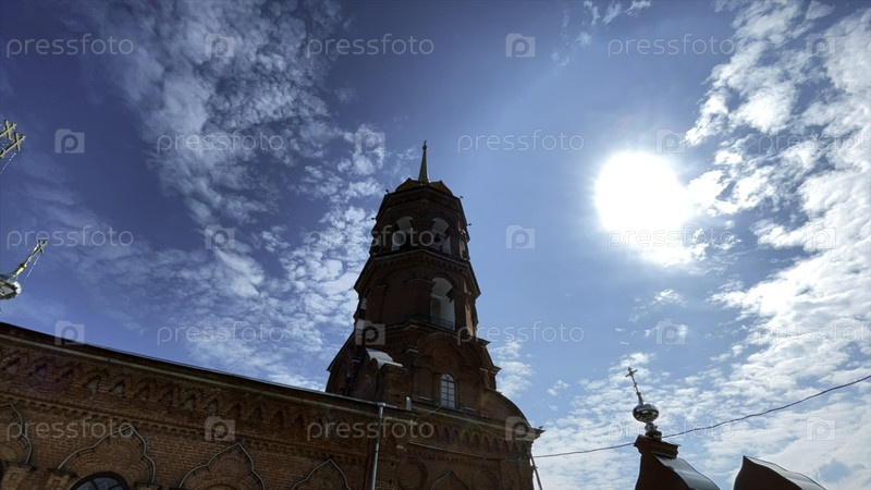 Низкий угол изображения башенного здания на ярко-синем фоне неба. Клип. Концепция архитектуры