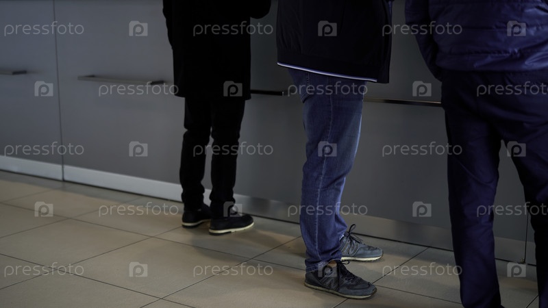Люди, останавливающиеся у стеклянного информационного стола в больнице или бизнес-центре. СМИ. Приемная и неузнаваемые мужчины