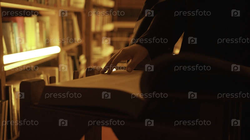 Ближайший снимок таинственного человека, открывающего большую книгу. Скриншоты. Человек открывает книгу в темной библиотеке с мигающим светом. Тайное общество с загадочными книгами в ночной библиотеке