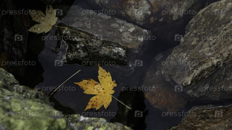Близкий план желтого листа в реке с большими камнями.Креативность.Природный осенний фон