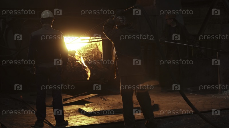 Рабочие-ремесленники в литейной фабрике манипулируют расплавленным металлом с помощью своих ремесел и инструментов
