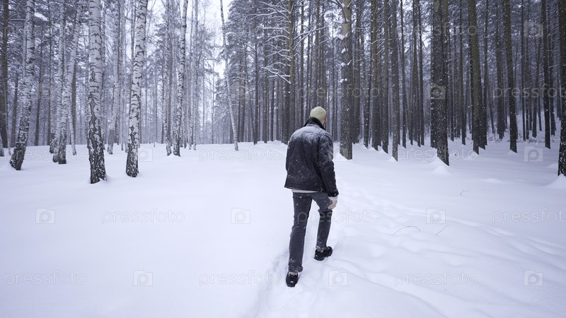 Стильный мужчина гуляет по зимнему лесу. СМИ. Задний вид стильного блондинка, идущего в зимний лес. Гулять по зимнему лесу при снегопаде