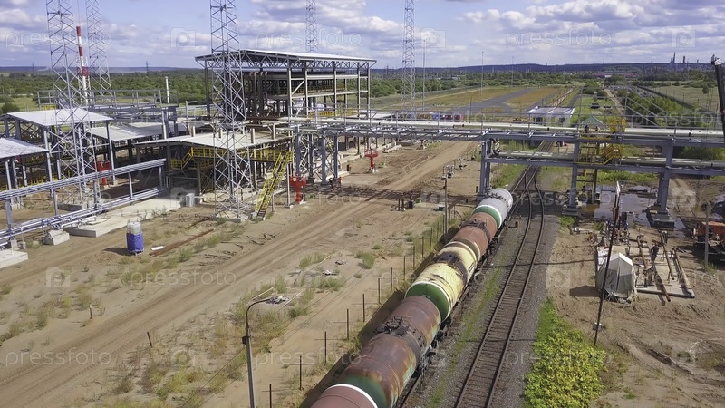 Вид сверху железной дороги и вокзала, находящегося в стадии строительства. Клип. Грузовой поезд стоит на рельсах на строящейся платформе. Железнодорожная станция под строительством рядом со станцией летом