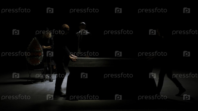 Театральная сцена. Стоковые кадры. Драма, разворачивающаяся с актерами и гробом, где мужчина кричит с сердитым выражением лица. Высокое качество 4k-записи