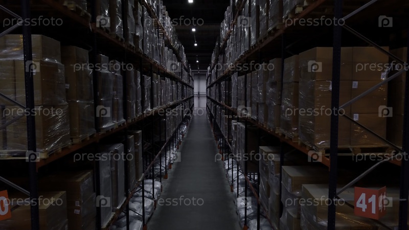 Хранилища крупные логистические торговые структуры с коробками на полках. Креативное. Промышленное производство, доставка товаров для транснационального экспорта в помещении