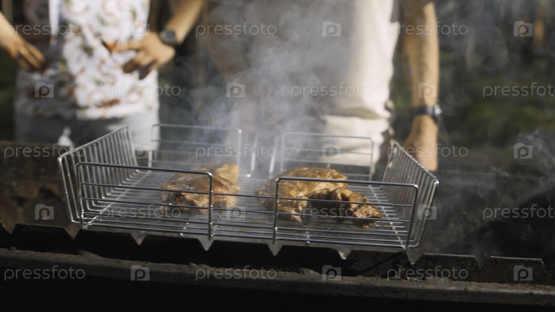 Близкий план мужчин, жарящих курицу на гриле в лесу. Скриншоты. Вкусная цыпленочка-гриль с барбекю в солнечный летний день. Мужчины готовят курицу на гриле и отдыхают в лесу