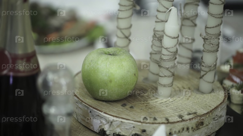 Увлекательное видео демонстрирует яркое зеленое яблоко на деревянных поверхностях, усиленное свечами, создавая уютную атмосферу и символизируя свежесть