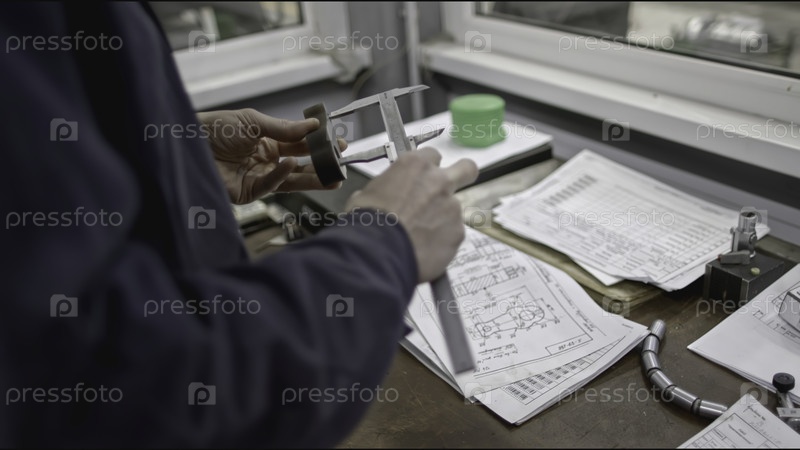 Рабочий измеряет часть по чертежам. Скотч-клип. Специалист производит измерения металлической части для проекта. Измерения и рисунки стальной части на заводе
